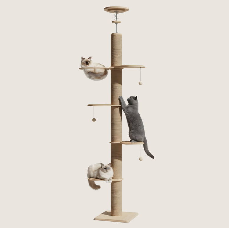 The Koven Floor-to-Ceiling Cat Tower gives them what no standard cat tree can — full vertical territory from floor to ceiling, anchored without a single hole in your wall. Five adjustable platforms, a thick full-wrap sisal post, an acrylic cave for private napping, and a spring-tension system that holds firm at any ceiling height. Their instincts, finally satisfied. Your home, still intact.