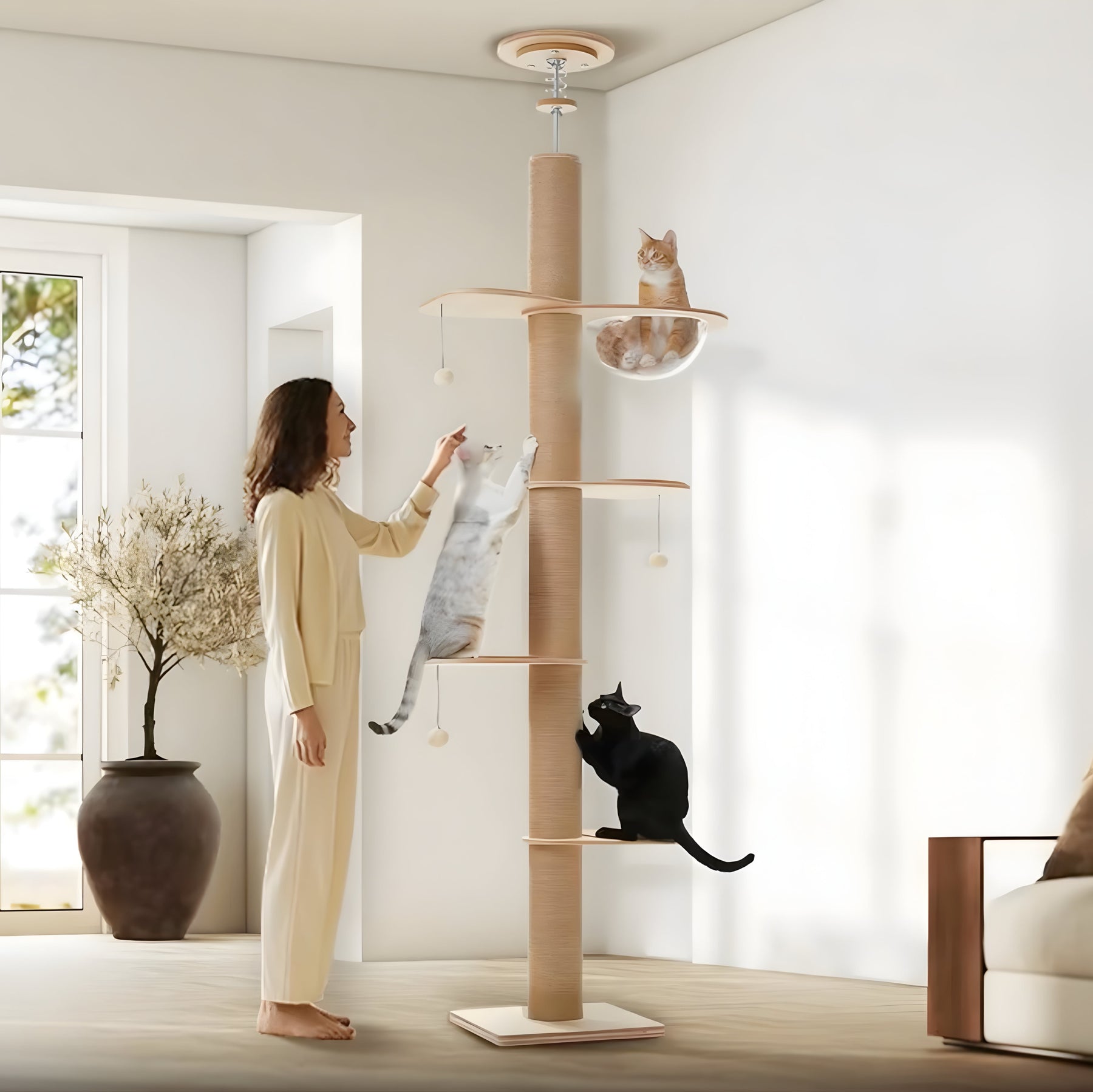 Natural wood. Full sisal. Acrylic cave. 79"–103" adjustable height. Zero wall damage.