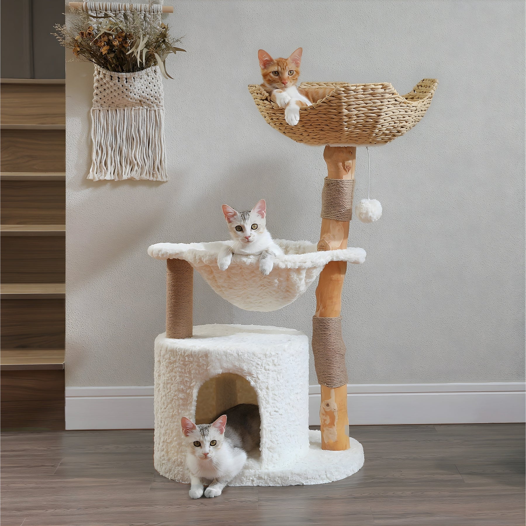 The Koven Shiro is built around a real natural wood tree trunk post — not a simulated wood finish, not a wrapped cylinder. An actual branch-form trunk with the texture and character of organic wood. A large handcrafted wicker basket perch at the top. A deep plush hammock at mid-level. A spacious ground condo wrapped in soft white fur. Three levels. Three resting styles. One piece of furniture your home will thank you for.
