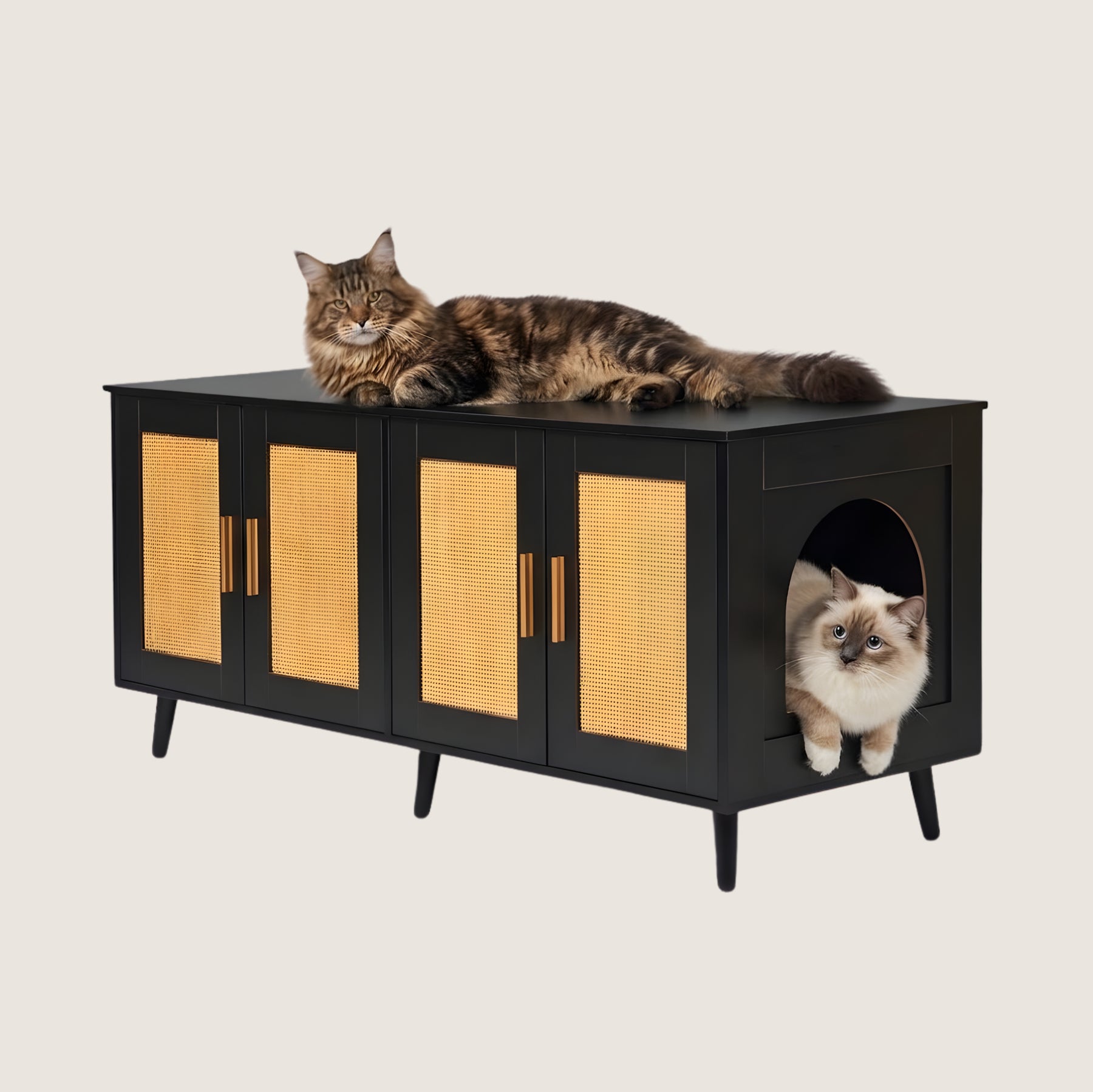 The Koven Ren is a large-format litter box enclosure designed to function as real furniture — a four-door cabinet with dual cat entry windows, a 150lb load-bearing top surface, and a form that works equally well as an end table, TV stand, or coffee table. It doesn't look like it hides a litter box. It looks like furniture. Because it is.