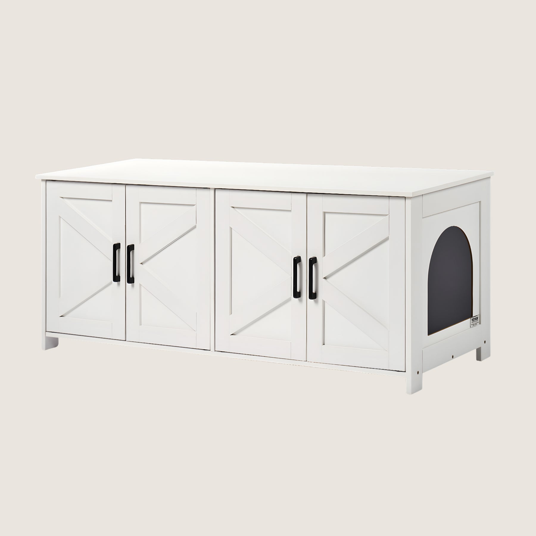 - Dual Side Entry Windows — Two arched entry openings — one on each end of the cabinet — give cats independent access without passing through the center storage area. Large enough for most cats to enter and exit comfortably. The arched opening keeps dogs out of the litter area. Both cats can use the cabinet simultaneously without competing for the same entry point.
