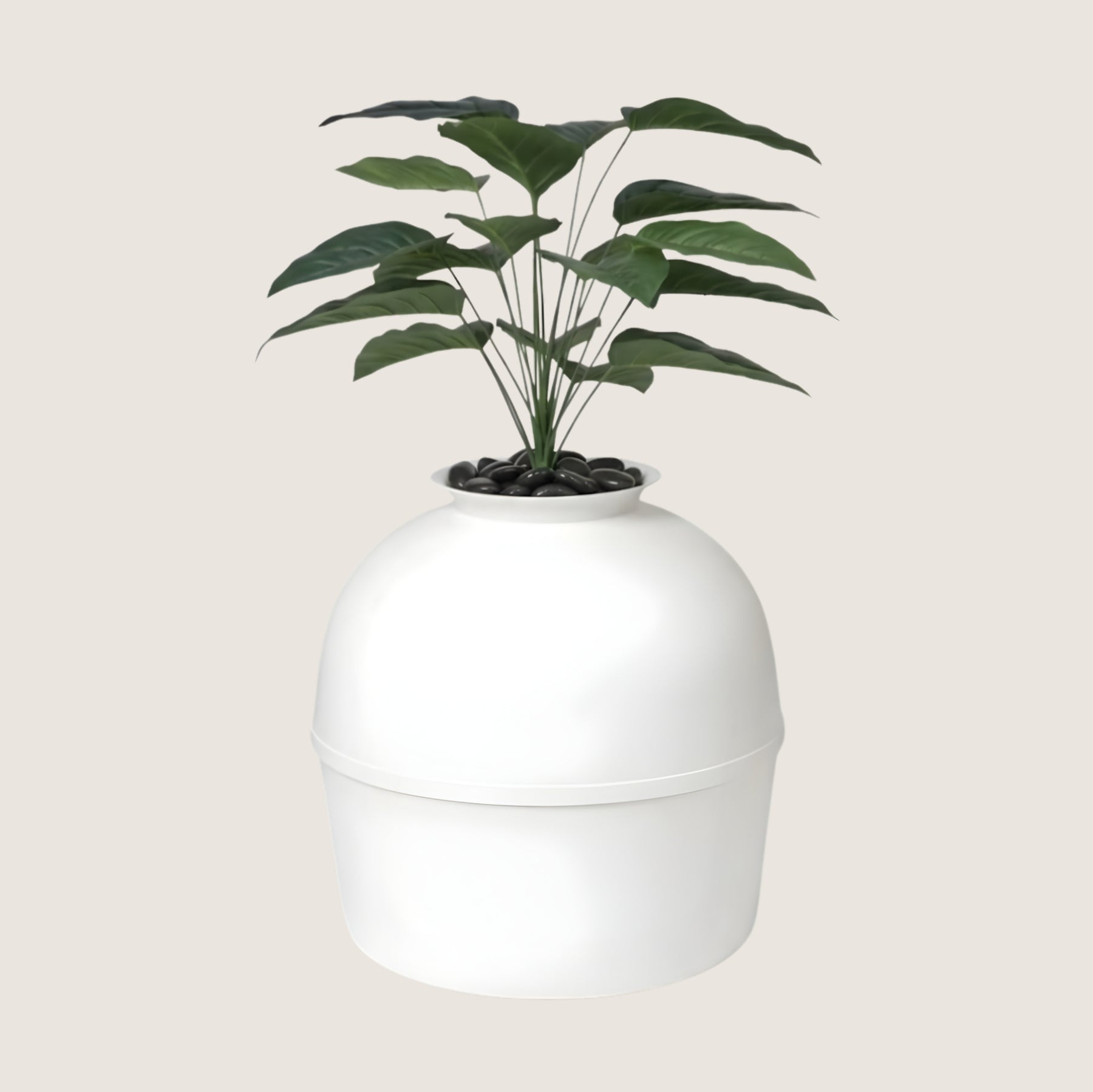 - Faux Plant + River Stones — Fully Included — The faux tropical plant and decorative river stones are included in the box. Nothing extra to source or purchase. The plant sits in the opening at the top of the dome, the stones surround the base of the plant. From across the room — or across the dinner table — the Tsuki reads as a large indoor planter. The illusion is complete out of the box.