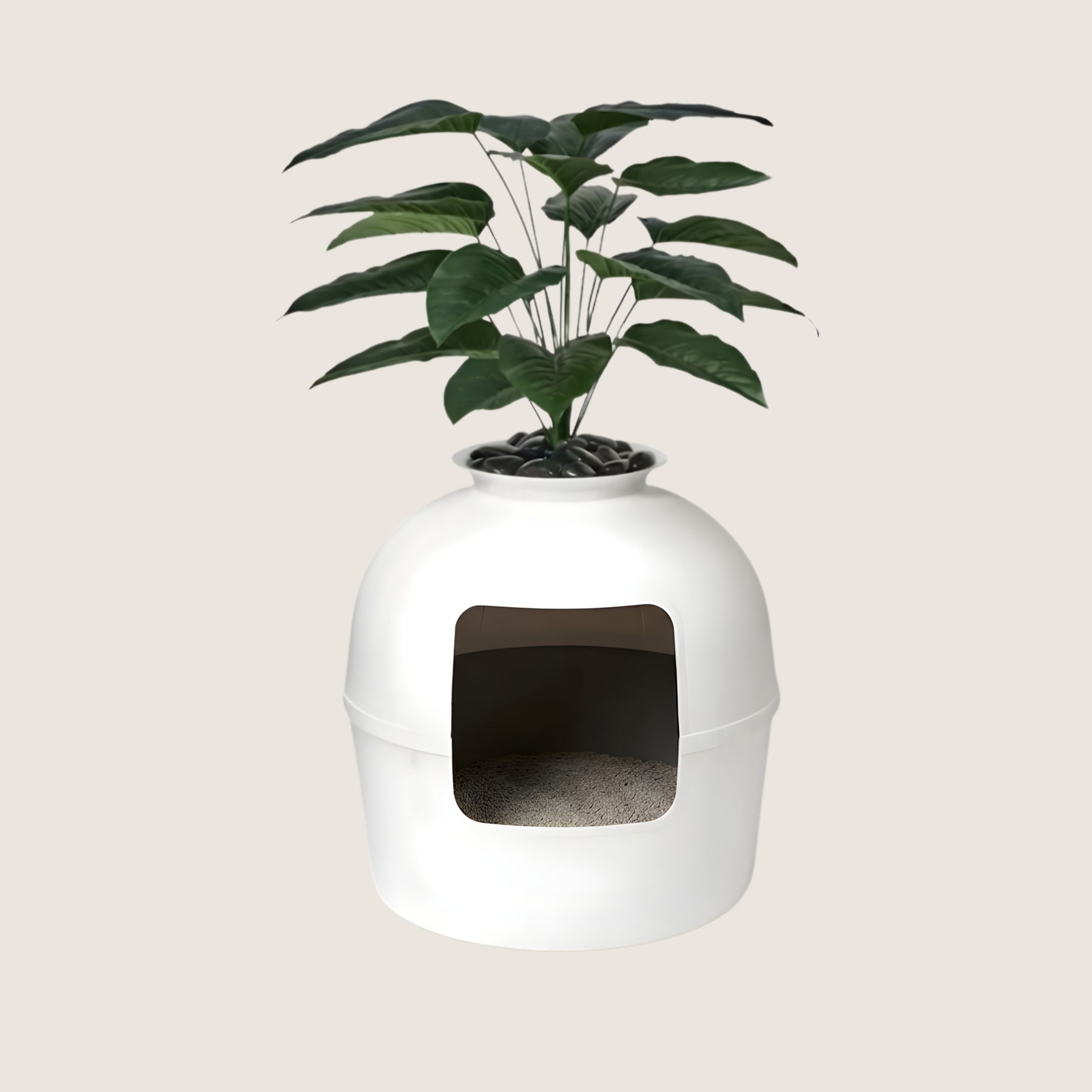 A cabinet hides a litter box. The Tsuki replaces it. There's a difference — a cabinet tells anyone who looks at it that something is being concealed. The Tsuki doesn't signal concealment at all. It reads as décor. A large ceramic-style planter in the corner of a room with a leafy plant growing out of the top doesn't prompt questions. Nobody walks past it wondering what's inside. Your cat enters through the bottom opening, uses the litter box privately, and exits. The plant stays. The stones stay. The litter box stays invisible.